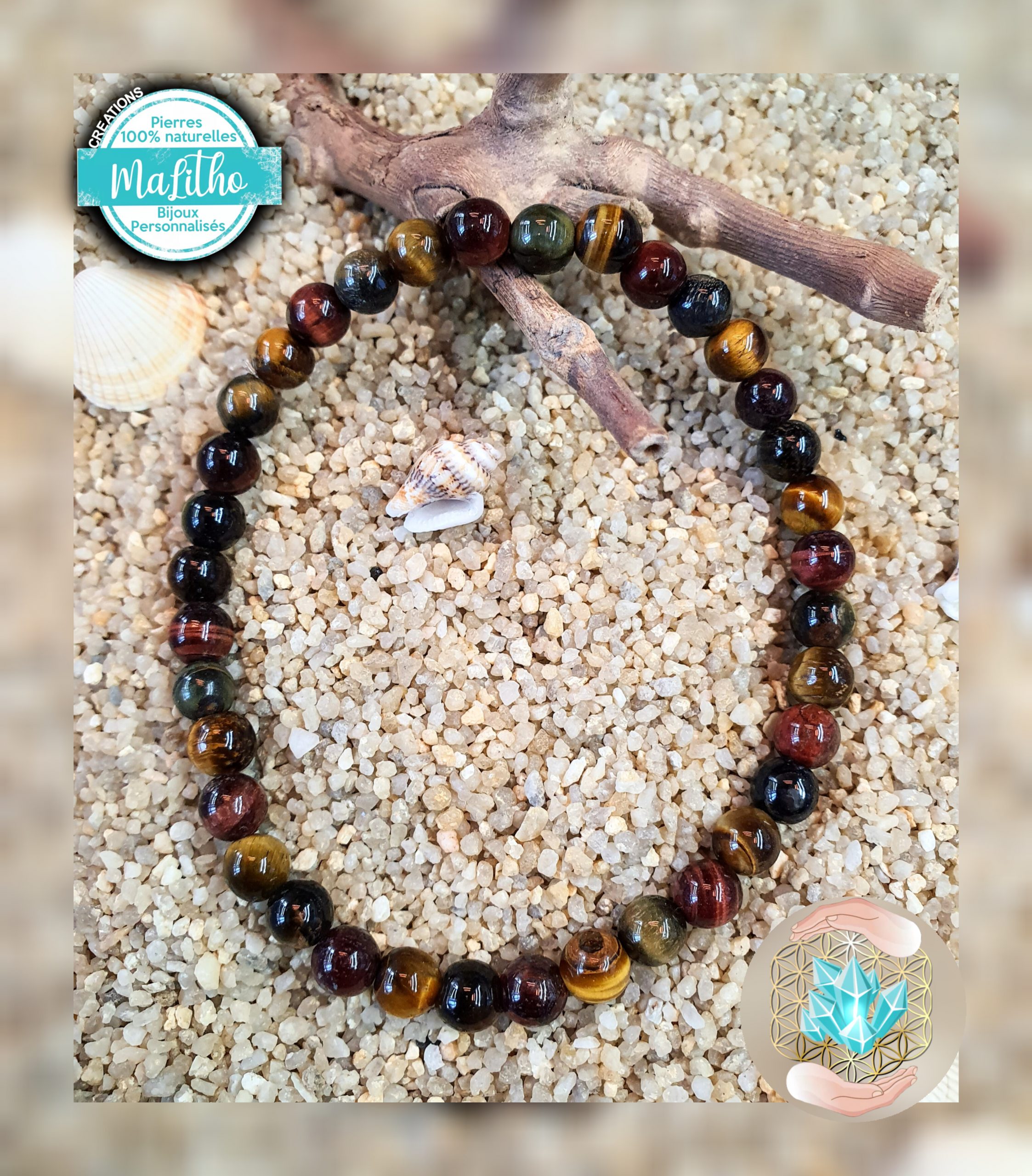 Je vous ai composé soigneusement avec des perles  NATURELLES d’une qualité  ”EXTRA” ce bracelet spécial PROTECTION de ma gamme ”MaLitho” avec LES 3 ”OEIL DE TIGRE”… OEIL DE TIGRE (œil de tigre jaune) bouclier de protection contre les énergies négatives, aide à la détente, donne la confiance en soi et l’assurance, OEIL DE FAUCON (œil de tigre bleu) protège DU MAUVAIS OEIL ET DE LA MAGIE ET OEIL DE TAUREAU (œil de tigre rouge) également très PUISANT EN PROTECTION CONTRE TOUTE ÉNERGIES NÉGATIVES mais qui vous donnera en plus  de L’ÉNERGIE ET DE LA FORCE. Lire les descriptions et explications en détails des bienfaits de ces pierres  dans la page ”recherche par catégorie de pierres”. PHOTO : PETITES PERLES EN 6mm, existe en choix d’option en perles moyenne en 8mm. Voir la page ”explication des grosseurs des perles”.